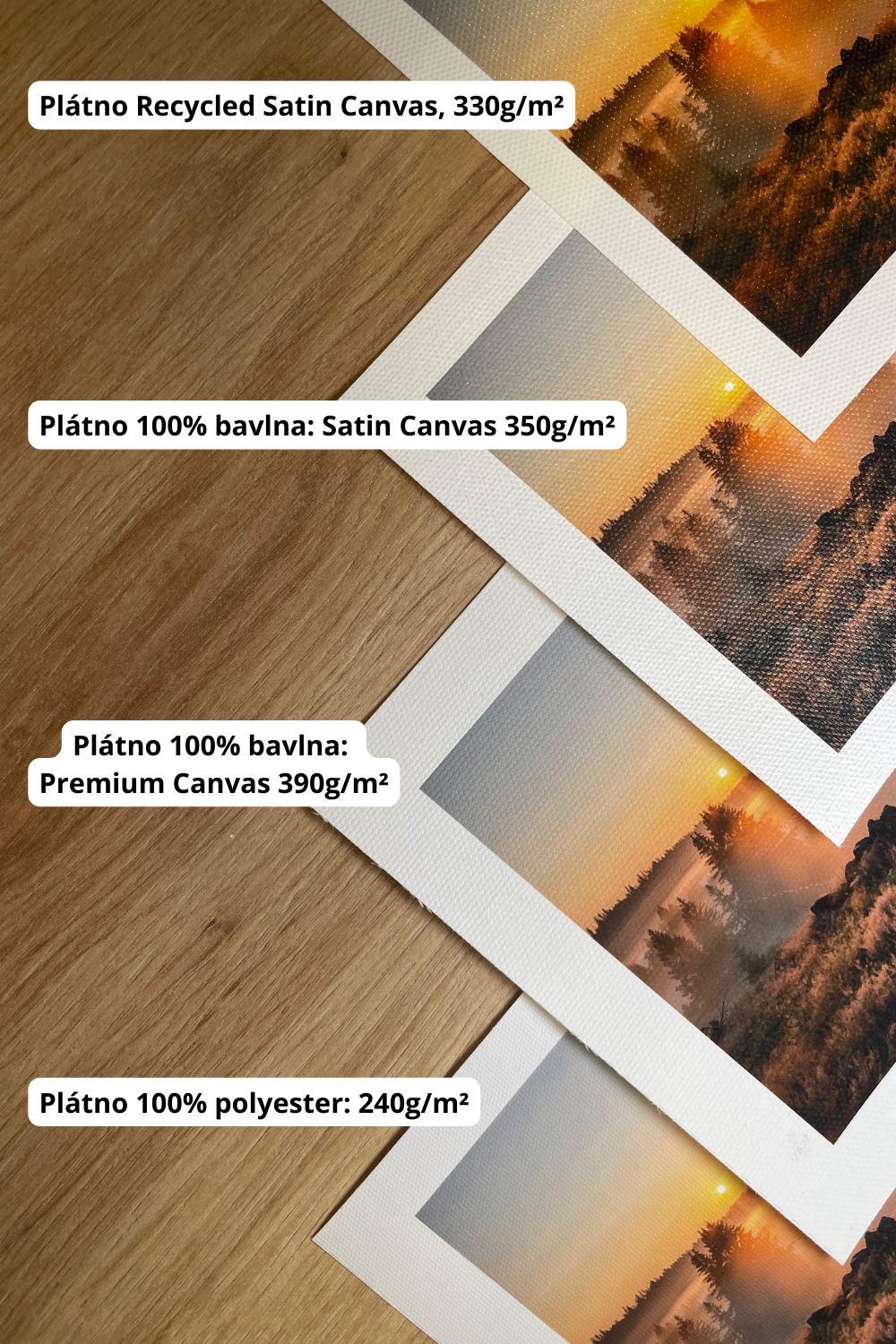 Všechny fotoobrazy z plátna Vám můžeme vytisknout na plátna Canvas 240g/m² - 100% polyester, Premium Canvas 390g/m² - 100% bavlna, Satin Canvas 350g/m² - 100% bavlna a Recycled Satin Canvas 330g/m².