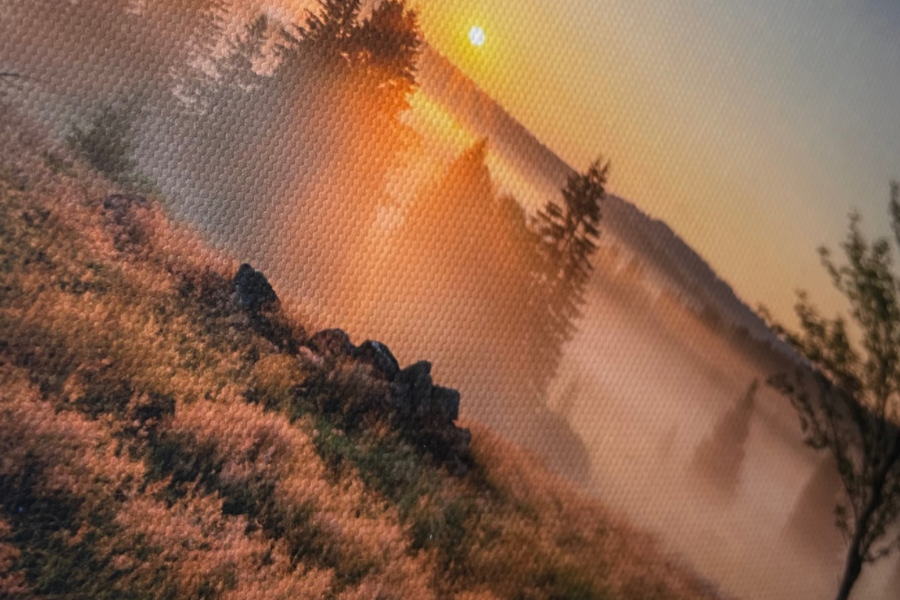 Plátno nám vytáhne barvy, jelikož povrchová úprava je lesklá. Pokud tedy budete mít například černé barvy, tak budou tedy o něco černější než na výtisku matném. Pokud si vyberete barevné barvy, opět budou o něco sytější než na výtisku matném.